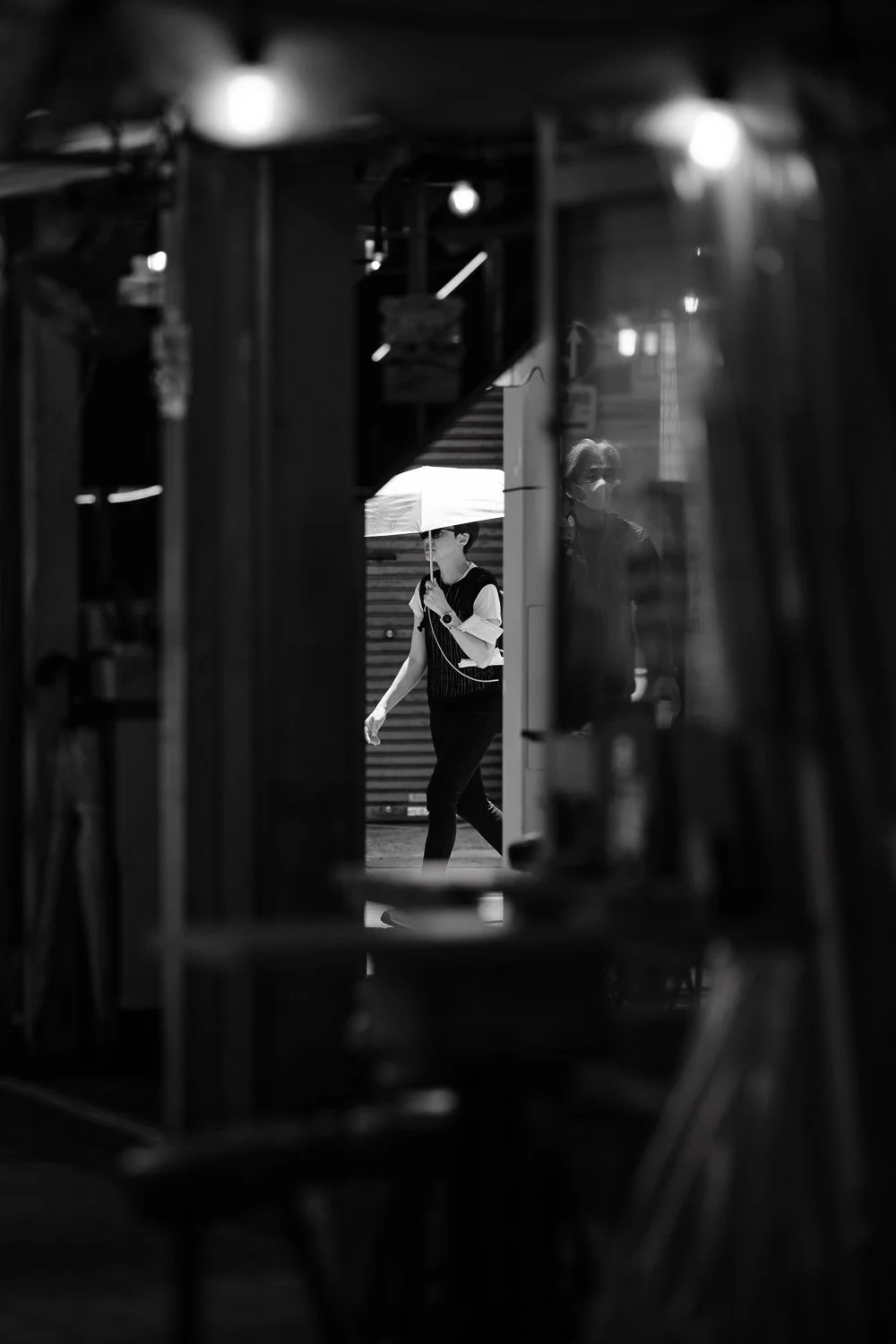 This image is shot through the open doors of the restaurant pictured above, #6—the pedestrian with a sun umbrella and the reflection of a second person.